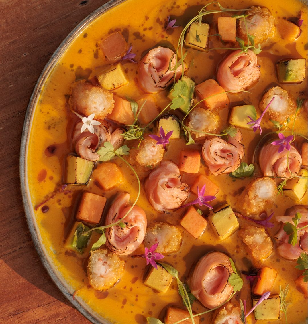 Ceviche frito de pulpo, camarón, calamar, atún y salmón, acompañado de camote frito, sarza criolla peruana y leche de tigre de ají amarillo.