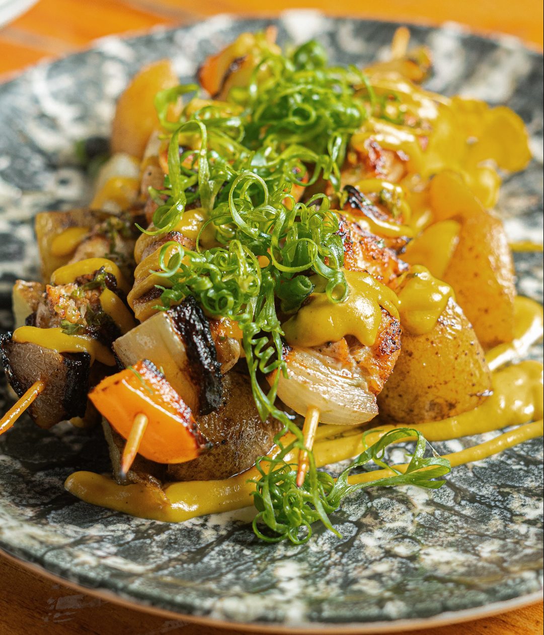 Brochetas de pollo con vegetales al grill, bañado con chimichurri y salsa a la huancaina, se acompaña con papas doradas.